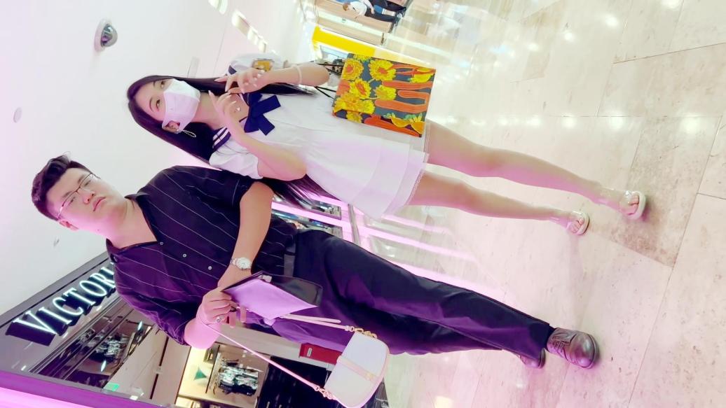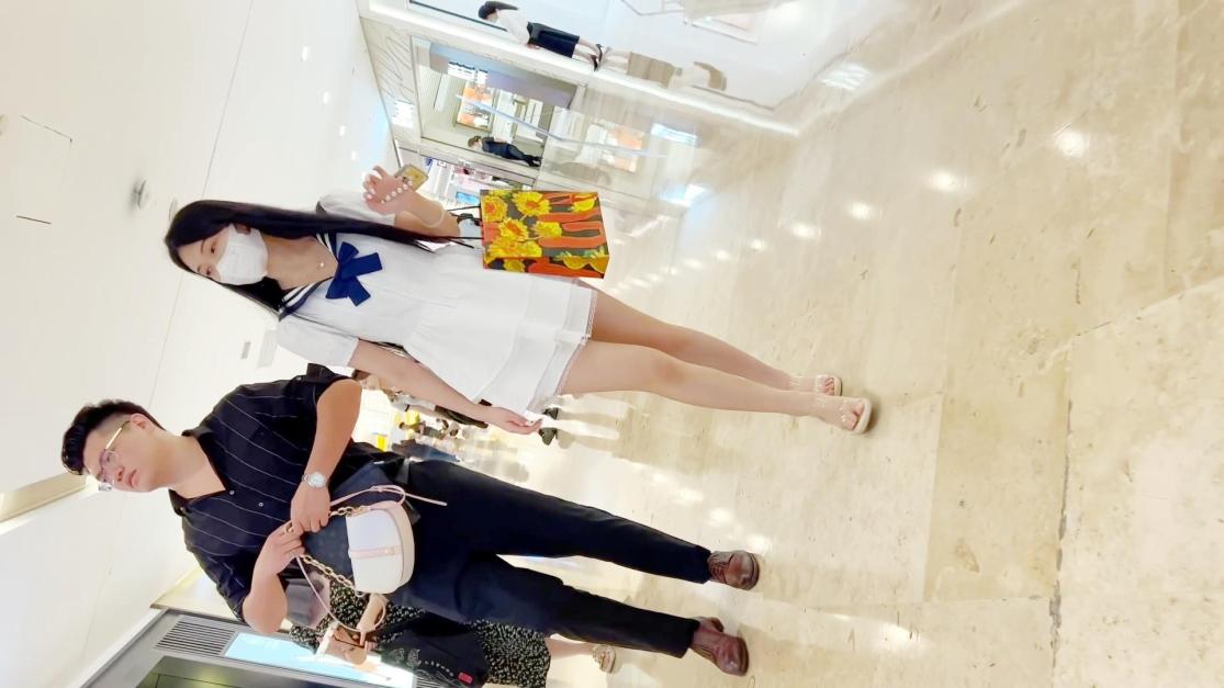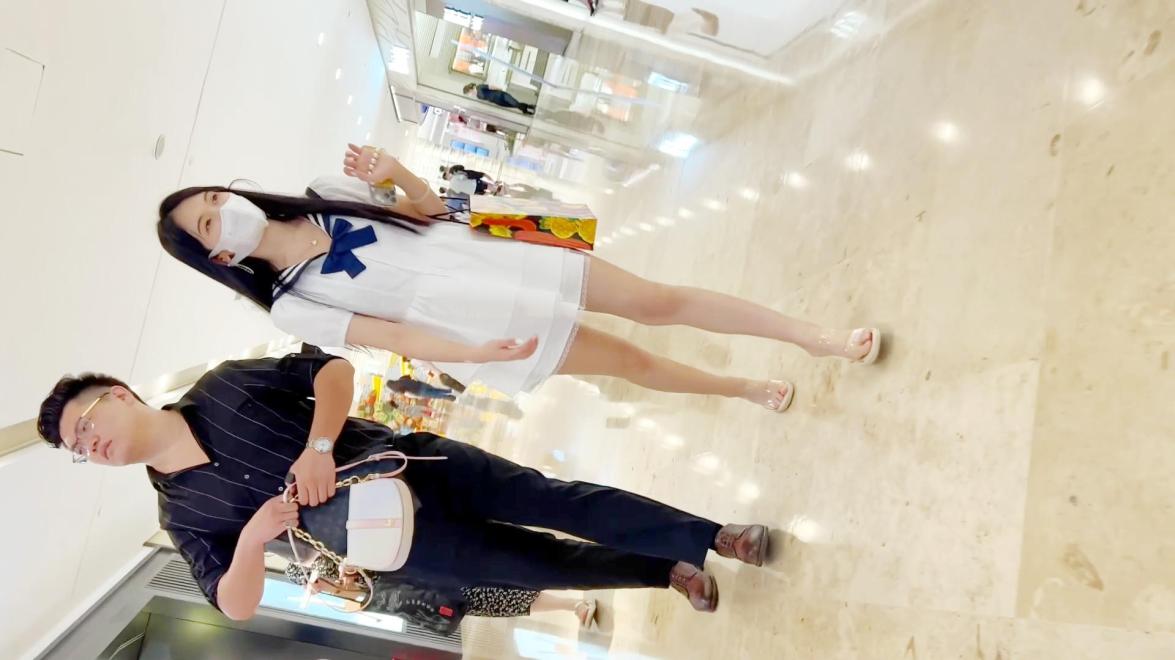 商城穿水手齐逼裙凉高跟绝色靓妞,蕾丝内浸湿了一片还被男友戳穴